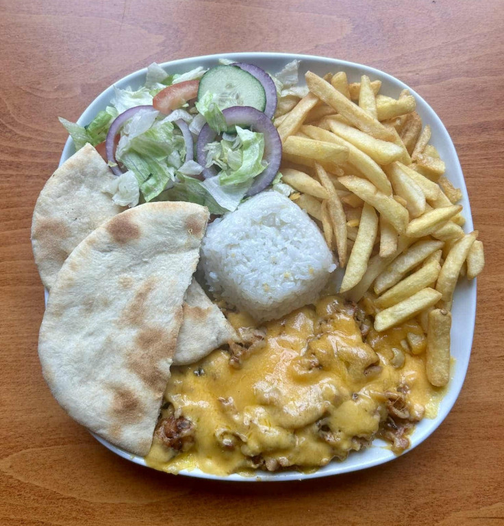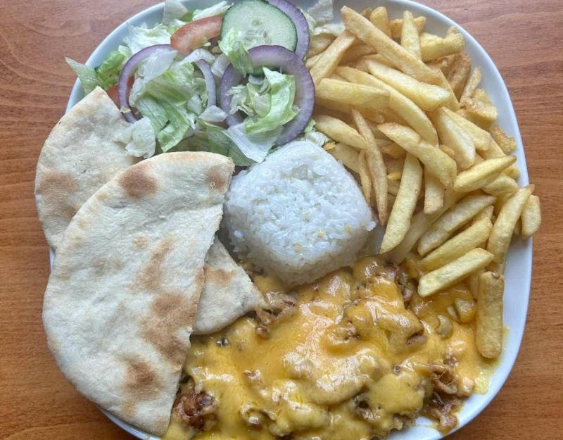 cheddar sajt, fokhagymás öntet, gyros hús, jégsaláta, lilahagyma, paradicsom, pita, rizs, uborka