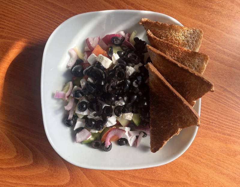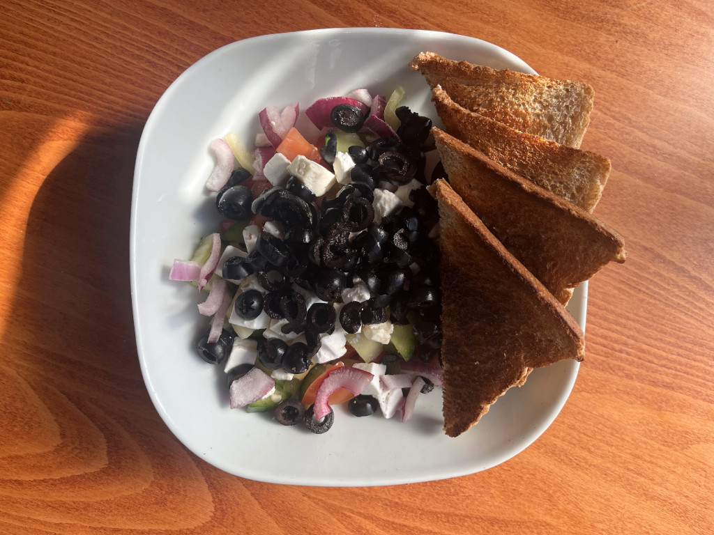 feta, lilahagyma, olivabogyó, paprika, paradicsom, pirítós, uborka